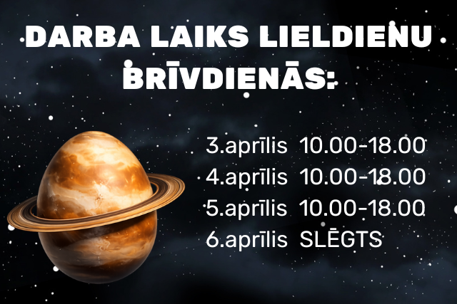 Centrs būs atvērts no 3. aprīļa līdz 5. aprīlim no plkst. 10.00 līdz plkst. 18.00, savukārt 6. aprīlī tas būs slēgts.